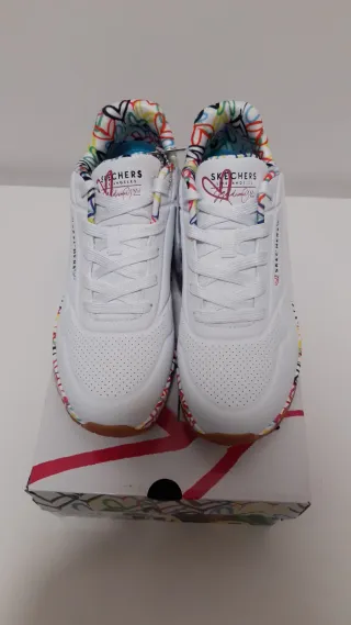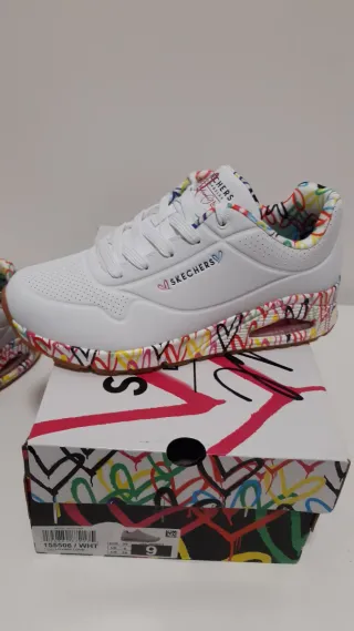 Scarpe sportive donna Skechers Uno Loving Love numero 39 Bianche con fantasia colorata Suola a trazione flessibile Memory foam raffreddato ad aria Doppi lacci (bianchi e colorati) Mai indossate (errato acquisto)