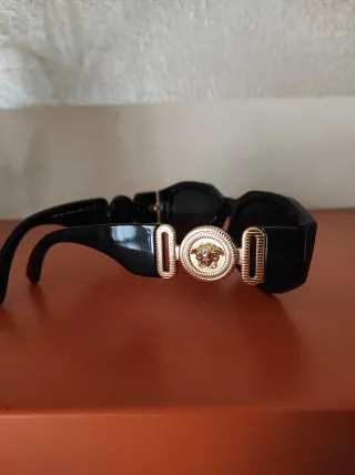 Eleganti occhiali da sole Versace con dettagli dorati. - Montatura in acetato nero lucido. - Iconica Medusa dorata al centro. - Lenti scure.