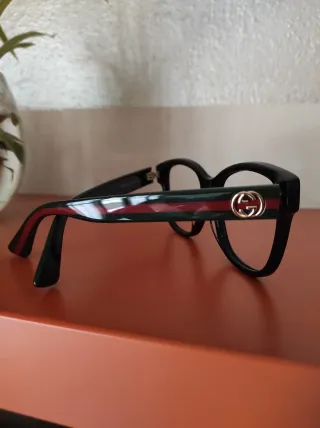 Montatura da vista Gucci originale, con design iconico. - Dettaglio banda verde e rossa. - Logo GG dorato sui lati.