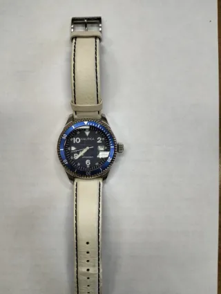 Orologio uomo Nautica, 46 mm di diametro. Sfondo colore blu e datario. Resistente 190 m. Perfettamente funzionante con cinturino originale colore bianco e libretto delle istruzioni. Modello A195284.
