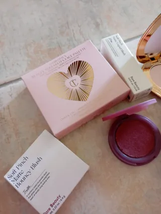 Lotto di prodotti makeup Charlotte Tilbury e Rare Beauty. - Charlotte Tilbury Beauty Soulmates Face Palette. - Rare Beauty Soft Pinch Matte Liquid Blush. - Rare Beauty Soft Pinch Matte Bouncy Blush.