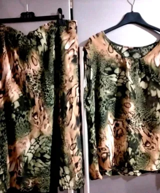Completo vintage con una stampa animalier unica. Elastico in vita, gonna con federa. Usata solo due volte dalla mamma. - Non spedisco con InPost Locker Point. - Stampa animalier. - Tessuto leggero e fluido, viscosa.