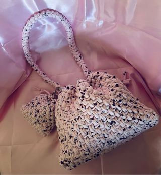 Pochette a forma di borsa, realizzata all'uncinetto con fantasia ciliegie. - Realizzata in filato di cotone. - Chiusura con coulisse. - Include una piccola pochette coordinata e una tracolla.