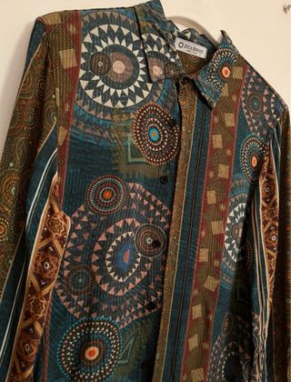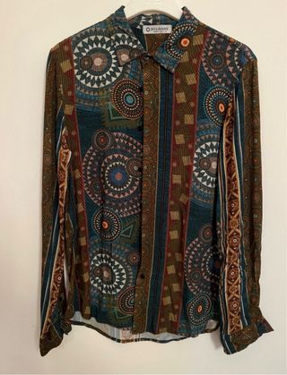Camicia a maniche lunghe con una vivace fantasia geometrica. Taglia M, ma veste S. Made in Italy. - Design con motivi circolari e a righe. - Colori assortiti. - Collo classico e chiusura con bottoni.