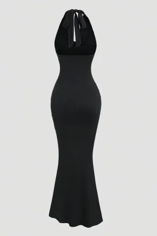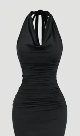 Elegante vestito lungo nero, perfetto per occasioni speciali. La sua silhouette valorizza la figura. Un po' elasticizzato. Nuovo mai usato perché un po' grande per me. Legato al collo, spalle scoperte. - Non spedisco con InPost Locker Point. - Scollo all'americana con fiocco. - Lunghezza maxi. - Tessuto morbido e confortevole.
