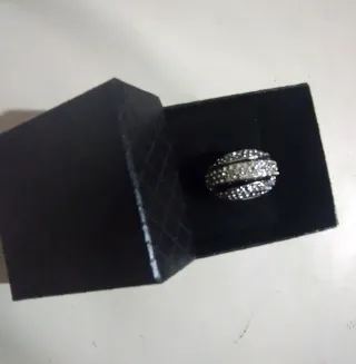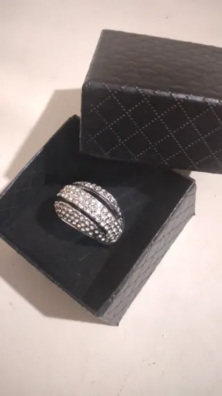 Elegante anello vintage di alta bigiotteria, un accessorio che aggiunge un tocco di classe. Manca qualche brillantino ma non si nota tanto. Non ricordo bene la misura credo 16. - Non spedisco con InPost Locker Point. - Design con pietre scintillanti. - Montatura in metallo color argento e nero.