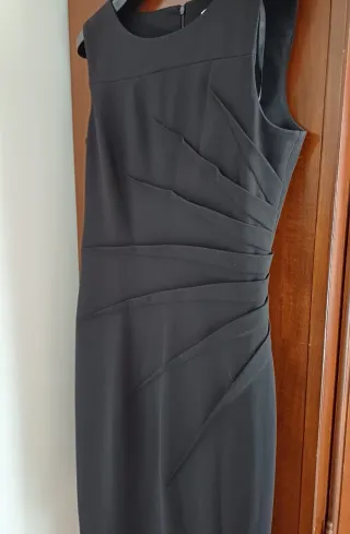 Elegante abito Calvin Klein. Design: Modello a tubino (sheath) con scollo rotondo e chiusura a zip posteriore. Caratteristica distintiva: Pieghe decorative laterali che creano un effetto a raggiera sulla vita. Materiale: mix di poliestere e elastan per una vestibilità leggermente elastica. - Lunghezza al ginocchio. Taglia ITA 42