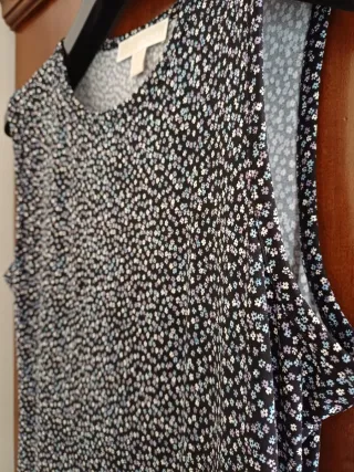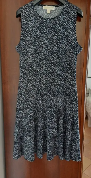 Elegante abito Michael Kors con una fantasia floreale su fondo blu scuro. - Modello smanicato - Scollo rotondo. - Corpetto aderente - Gonna a balze - Vestibilità elasticizzata e confortevole La stampa è composta da piccoli fiori bianchi, azzurri e lilla su fondo scuro. Taglia ITA 42