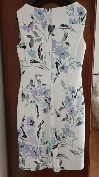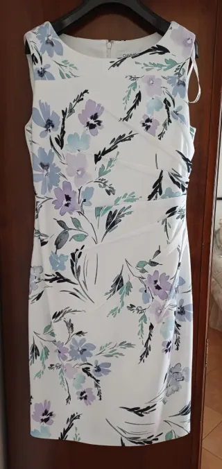 Elegante abito corto Calvin Klein con stampa floreale. Un capo versatile e raffinato. Design: Modello a tubino con scollo rotondo e chiusura a zip posteriore. Caratteristica distintiva: Pieghe decorative laterali che creano un effetto a raggiera sulla vita. Materiale: mix di poliestere e elastan per una vestibilità leggermente elastica. - Lunghezza al ginocchio. Taglia ITA 42
