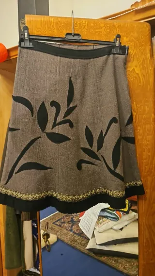 Gonna artigianale con un design unico. - Tessuto principale in velluto marrone. - Dettagli in panno damascato nero. - Orlo decorato con passamaneria dorata e nera. - Applicazioni floreali nere sul davanti.