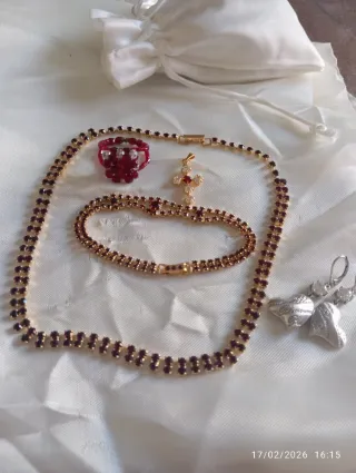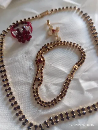 Elegante set di bigiotteria vintage anni 70 perfetto per aggiungere un tocco di classe. - Collana con strass rossi e chiusura dorata. - Bracciale coordinato con strass rossi. - Anello con pietre rosse e dettagli bianchi. - Ciondolo a forma di croce con strass rossi e bianchi. - Paio di orecchini pendenti a forma di cuore con strass argentati