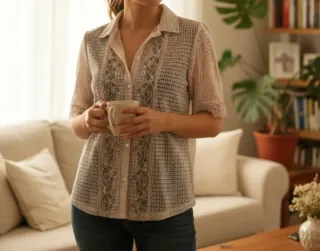Elegante camicetta Intimissimi, perfetta per aggiungere un tocco di stile. - Tessuto leggero e trasparente. - Dettagli ricamati sul davanti. - Maniche corte con bordo in pizzo.