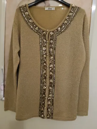 Elegante cardigan Jason, perfetto per aggiungere un tocco di classe al tuo guardaroba. - Tessuto scintillante color oro. - Dettagli ricamati e perline sul davanti. - Chiusura con bottoni. - Maniche lunghe.