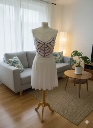 Elegante abito da donna con un design unico. - Fantasia geometrica sul corpetto. - Gonna ampia e fluida.