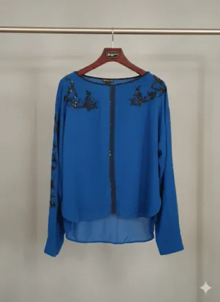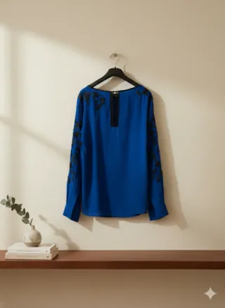Elegante blusa da donna con dettagli ricamati. - Colore blu vivace. - Maniche lunghe. - Ricami neri decorativi sul davanti e sulle maniche. - Scollo rotondo con bordo nero. - Tessuto leggero e fluido.