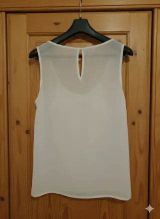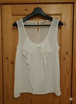 Elegante canottiera da donna con dettagli a balza e fiocco sul davanti. - Tessuto leggero e trasparente. - Scollo rotondo con apertura a goccia sul retro.