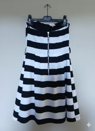 Elegante abito da donna con un vivace motivo a righe. - Design senza spalline. - Fantasia a chevron sul corpetto. - Gonna a pieghe. - Orlo ondulato.