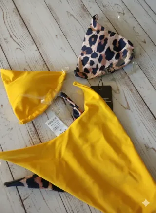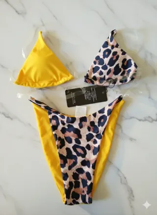 Top: Un classico modello a triangolo, ma con una particolarità: le due coppe sono diverse tra loro. Una è in tinta unita giallo sole, l'altra presenta una stampa animalier (leopardata) con macchie scure su fondo beige/rosato. Slip: Riprende il tema del top con un pannello centrale leopardato e fianchi gialli a contrasto. Ha un taglio a vita alta e sgambato, tipico dello stile anni '80/'90.