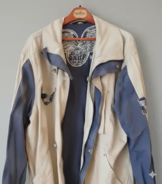 Giacca da uomo in stile vintage, perfetta per un look casual. - Design con pannelli laterali blu. - Chiusura con alamari e zip. - Tasche frontali. - Dettagli con zip e bottoni a pressione.