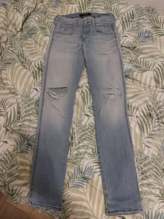 Jeans Replay da uomo, modello con strappi sulle ginocchia. Usati poche volte. Vendo perché stretti - Vestibilità slim. - Lavaggio chiaro. - Dettagli strappati. - Tasche frontali e posteriori.
