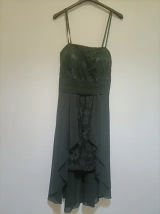 Elegante vestito nero con dettagli in pizzo. - Corpetto in pizzo. - Cintura in vita. - Gonna asimmetrica con sovrapposizione in pizzo.