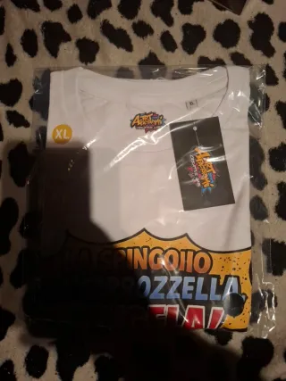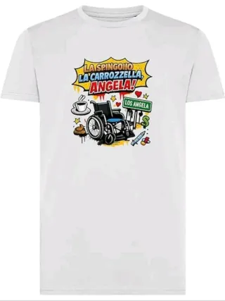 T-shirt bianca con una stampa grafica originale e divertente. - Stampa con fumetto LA SPINGOIIO LA CARROZZELLA ANGELA! - Elementi grafici aggiuntivi come tazzina di caffè, emoji, segnaletica LOS ANGELA e simboli vari.