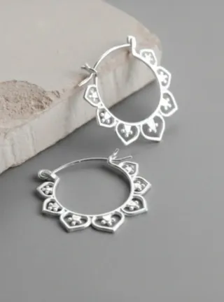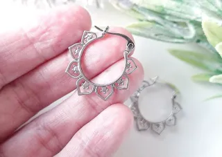 Eleganti orecchini in stile bohémien, perfetti per aggiungere un tocco di originalità al tuo look. - Design dettagliato con motivi floreali e puntini. - Chiusura a scatto sicura. In acciaio placcato argento. Dimensioni 2.00 x 2.00 cm.