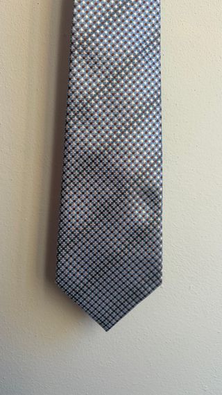 Elegante cravatta sartoriale realizzata interamente a mano a Roma (Via S. Cecilia, 12), come indicato dall'etichetta interna "La cravatta su misura". • Un pezzo di alta qualità, ideale per chi cerca un accessorio distintivo o per collezionisti di memorabilia istituzionali. * Dettagli Esclusivi: Presenta il fregio ricamato della Polizia di Stato sulla parte interna (codino). * Materiale: 100% Pregiata Seta Italiana. * Lavorazione: Artigianale, "Lavorazione a mano" Si nota il punto a mano sul retro che garantisce elasticita e una tenuta del nodo perfetta. * Fantasia: Raffinato motivo geometrico a micro-punti nei toni del carta da zucc