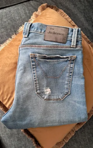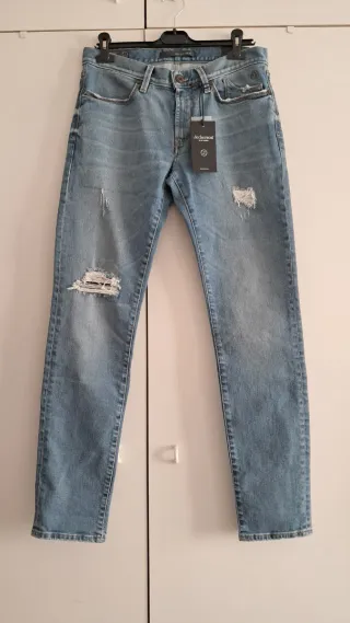 Jeans uomo slim fit JECKERSON modello con strappi. Nuovo di campionario, è presente all'interno una scritta che recita "capo prova". La scritta essendo interna non inficia in alcun modo l'aspetto del jeans, è possibile vederla nell'ultima foto. Taglia italiana 47, americana 33. Per maggiori dettagli e misure vedere le foto. Disponibile per eventuali altre misurazioni.