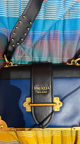 Borsa a tracolla Prada, un accessorio elegante e versatile. - Mai usata, in condizioni pari al nuovo. - Design bicolore con finiture dorate.