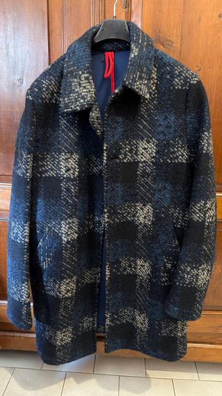 cappotto da donna modello over mai indossato, ha ancora le tasche cucite. - Fantasia geometrica blu e grigia. - Chiusura doppiopetto con bottoni. - Collo a revers classico.