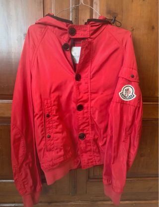 Giubbotto Moncler originale in un vivace colore rosso. - Cappuccio con cordoncino. - Chiusura frontale con bottoni. - Tasche laterali. - Logo Moncler sulla manica.