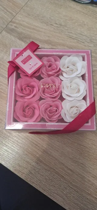 9 fiori di sapone di 3 tonalità di colore diverso con tenue odore di rosa. I petali possono essere dispersi nell'acqua della vasca o utilizzare un singolo petalo per lavarsi le mani o semplicemente utilizzati come elementi d'arredo per profumare
