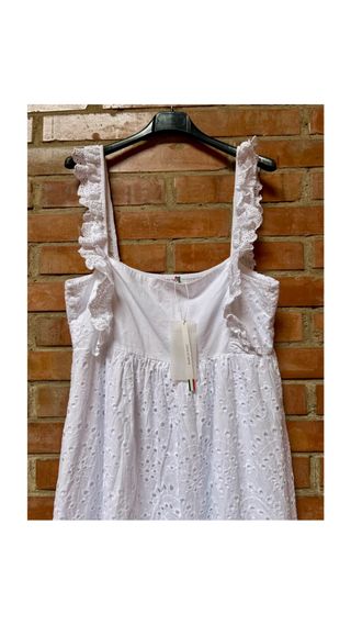 Splendido Abito Lungo Colore Bianco Ottico in 100% Cotone con Lavorazione Pizzo San Gallo Tessuto e’ Fresco e Leggero di Alta Qualità Spalline Larghe Decorate con Romantici Volant sempre in Pizzo San Gallo , Dotata di una Pratica Sottoveste Interna per La Metà dell’Abito (Sempre in Cotone) per Evitare Trasparenze Taglia Unica (Grazie al Taglio Morbido si Adatta Bene a Diverse Fisicità) Spalline e Schiena Dietro Elasticizzate Made in Italy Nuovo con Cartellino Misure a Abito Steso Petto 44 cm Lunghezza 119 cm #abitosangallo #abitosangallodonna #sangallo #sangallobianco #sangallocotone #sangallocotton