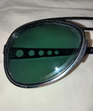 Occhiali da sole con montatura metallica e lenti verdi. Manca la piccola vite dell'asta sinistra - Design aviator. - Dettagli traforati su aste stile anni 60. - Montatura color argento. Hanno piccoli graffietti su entrambe le lenti e sulla montatura ma nel complesso buono stato Hanno un alone che circonda entrambe le lenti Misurano da asta ad asta esterna 14,5 cm, 14 cm nella parte interna La lente nella sua parte piú lunga in altezza misura 4,7 cm ed in larghezza 5,8 cm