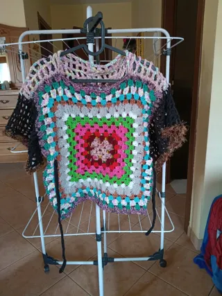 Maglia lavorata a mano all'uncinetto con la tecnica Granny.Maniche larga 3/4.con laccio in vita. - Composizione in misto lana. - Design patchwork colorato.