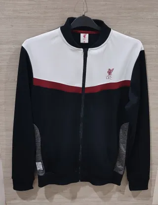 Felpa sportiva con zip del Liverpool. - Design a blocchi di colore con bianco, bordeaux e nero. - Logo del Liverpool ricamato sul petto. - Inserti laterali in tessuto grigio melange. - Patch You'll Never Walk Alone sulla manica sinistra. Taglia M. Ottime condizioni.