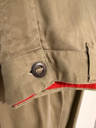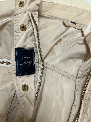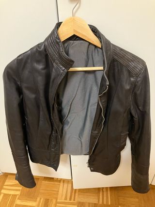 Giacchetta in pelle 100% da uomo. La cerniera non si chiude e ha un piccolo strappo nella tasca interna sinistra come si può vedere nelle foto. - Fodera interna a righe. - 2 tasche interne con cerniera. - Tasche laterali.