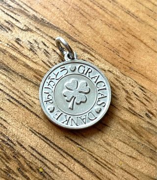 Ciondolo Dodo in argento a forma di moneta con quadrifoglio e corona con cuori. - Scritta THANKS MERCI GRAZIE sul bordo. - Logo DoDo al centro.