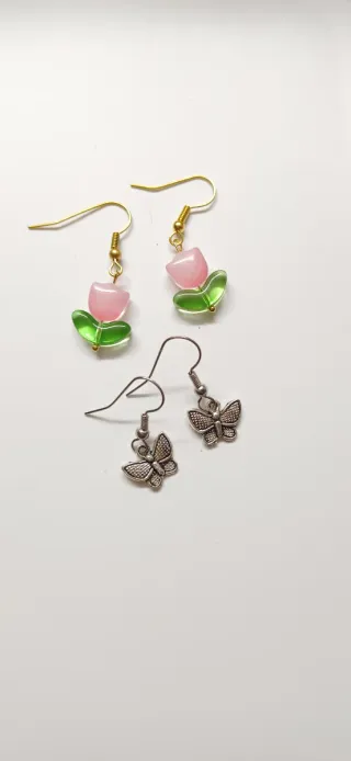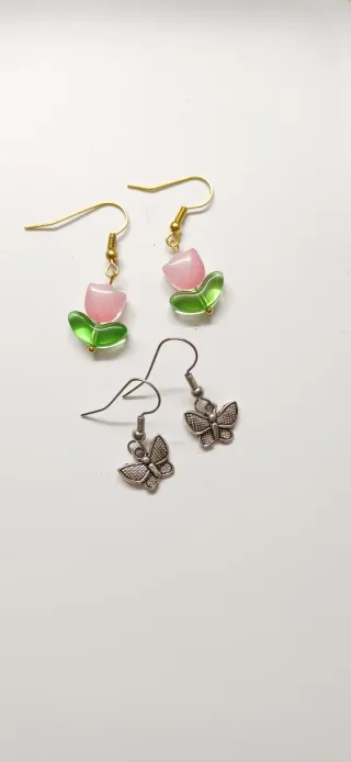 Deliziosi orecchini a forma di tulipano con petali rosa e foglie verdi. - Design floreale unico. - Ganci dorati per un tocco di eleganza. - Un paio di orecchini con farfalle in metallo color argento.