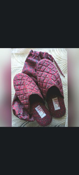 Pantofole da uomo in tessuto trapuntato. -Marchio: La via delle Indie - Oro -N. 43 -Design: fantasia paisley nei colori bordeaux, blu, giallo e bianco. -Nuove senza cartellino, in quanto mai indossate. -Corredate di custodia di uguale tessuto e fantasia, che le rende facilmente trasportabili nei viaggi. Comode ed eleganti, sono un'ottima idea regalo.
