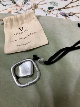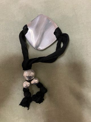 Collana con ciondolo dal design unico. - Ciondolo in metallo color argento. - Cordino nero regolabile.
