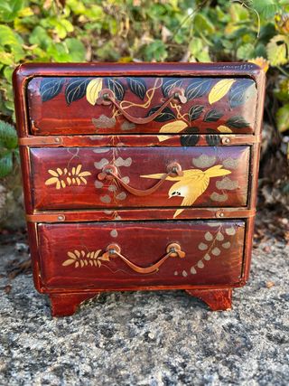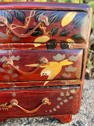 Delizioso portagioie in miniatura, ispirato allo stile Tansu giapponese. Perfetto per custodire piccoli tesori. - Design a tre cassetti. - Decorazioni floreali e uccelli dorati su sfondo rosso. - Maniglie in metallo color bronzo.