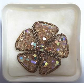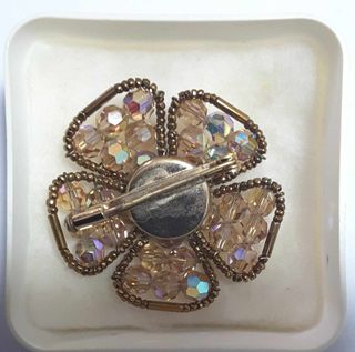 Bellissima spilla a forma di fiore, realizzata con perline e cristalli sfaccettati. Spilla anni 60 in filigrana, misure: 4 x 4,5 Cm. - Design floreale. - Dettagli in metallo dorato. - Cristalli con riflessi iridescenti.
