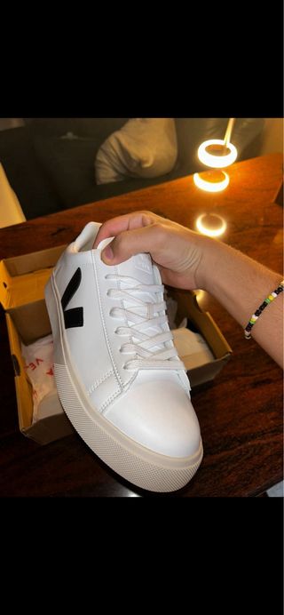 Zapatillas de la marca Veja en color blanco con el icónico logo en negro. - Diseño clásico y versátil. - Cordones blancos. - Suela de goma.