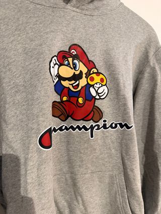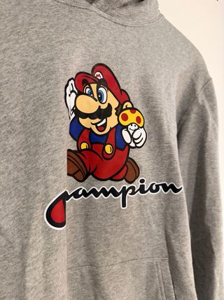 Felpa grigia con stampa di Super Mario e logo Champion. Design esclusivo di Super Mario. Logo Champion. Taglia M.