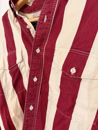 Camicia a maniche lunghe in stile vintage con un accattivante design a righe verticali. Perfetta per un look casual e retrò. Caratteristiche: design a righe rosse e beige, collo con bottoni, due tasche sul petto.