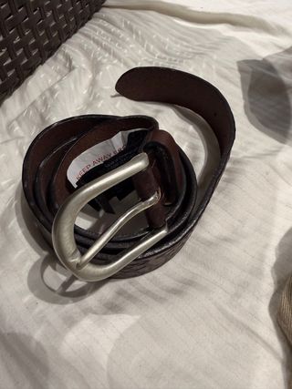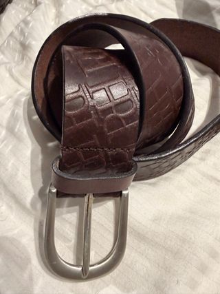 Cinturone in pelle elegante con design testurizzato. Fibbia metallica argentata. Finitura in rilievo con il logo del marchio.