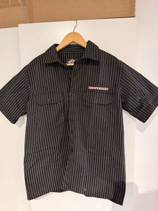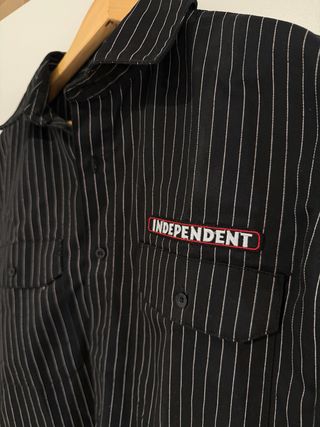 Camicia a maniche lunghe con un design a righe verticali bianche su sfondo nero. Presenta un patch ricamato con il logo del marchio sul petto. Chiusura con bottoni, due tasche sul petto con bottone, colletto alla francese.