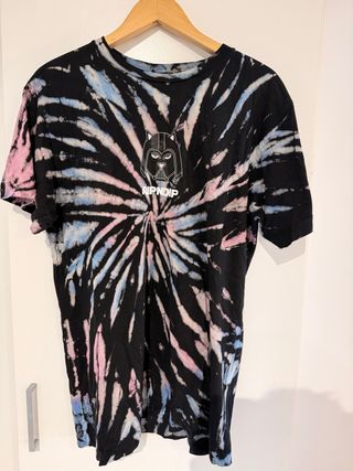 Maglietta con un accattivante design tie-dye ispirato a Star Wars. Design a spirale tie-dye. Grafica di Darth Vader con orecchie da gatto. Logo Ripndip sul petto.